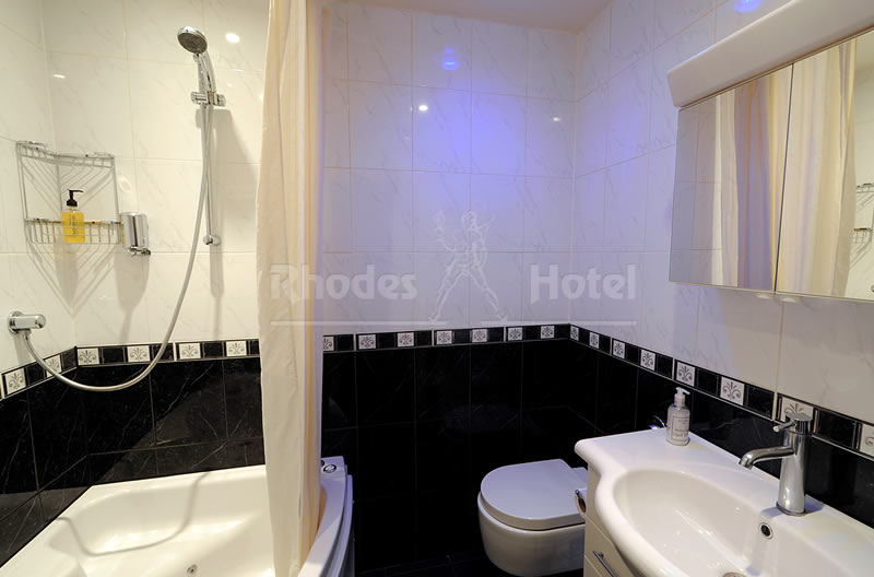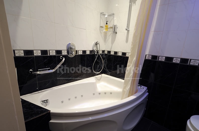Rhodes Hotel has a wide range of rooms from compact size to larger, for the individual traveler to families of up to 6 people in a room. All rooms are en suite with shower room or the Deluxe rooms have a jacuzzi bathtub. Every room has a window, flat screen tv, small writing desk, tea & coffee making facilities and an empty minibar fridge for you to keep your personal snacks and drinks cool.