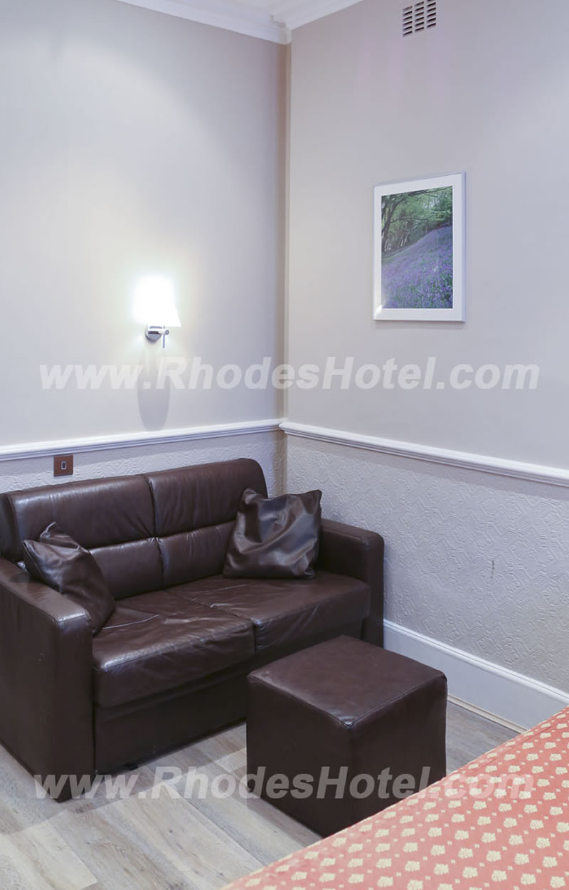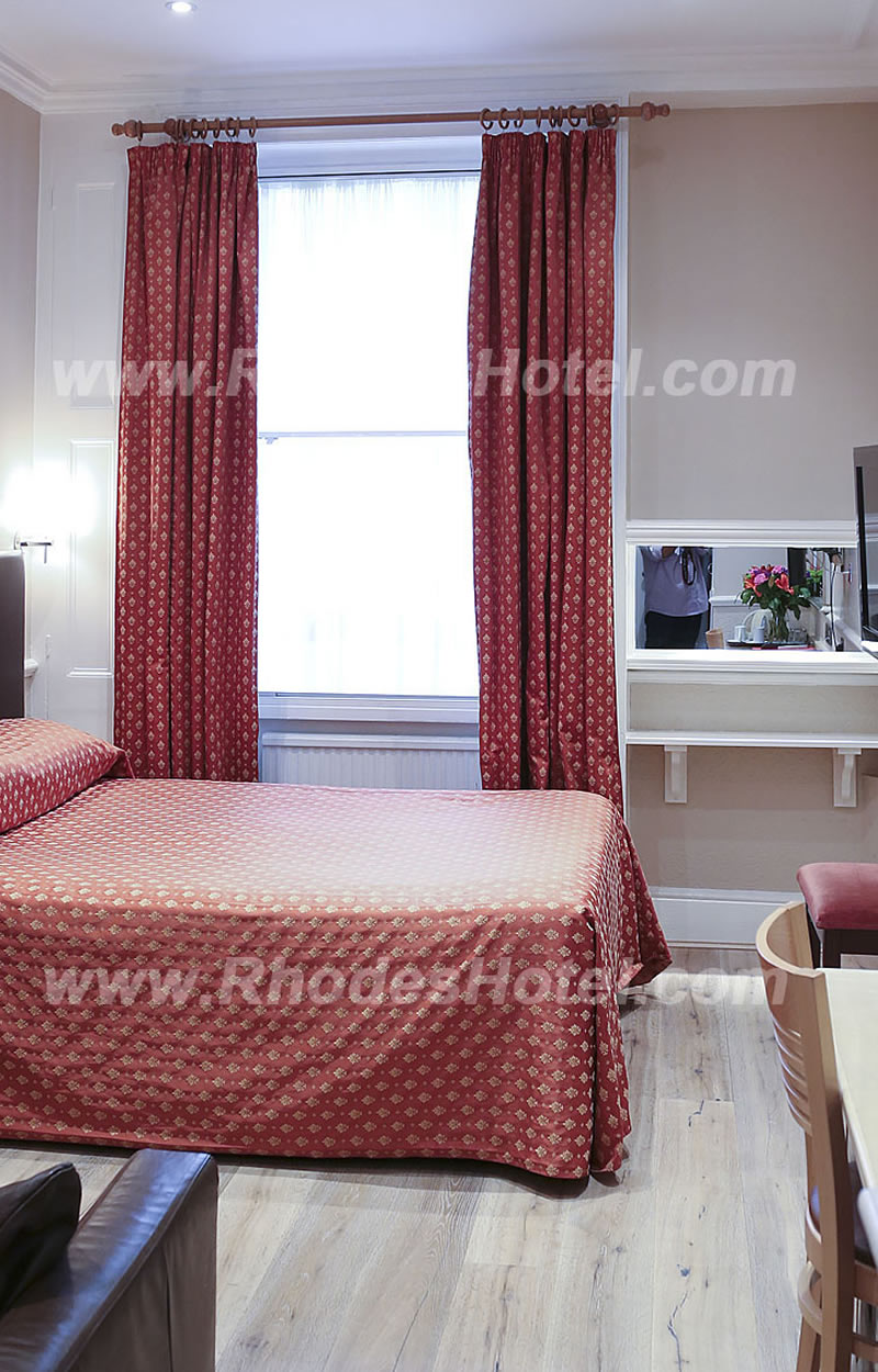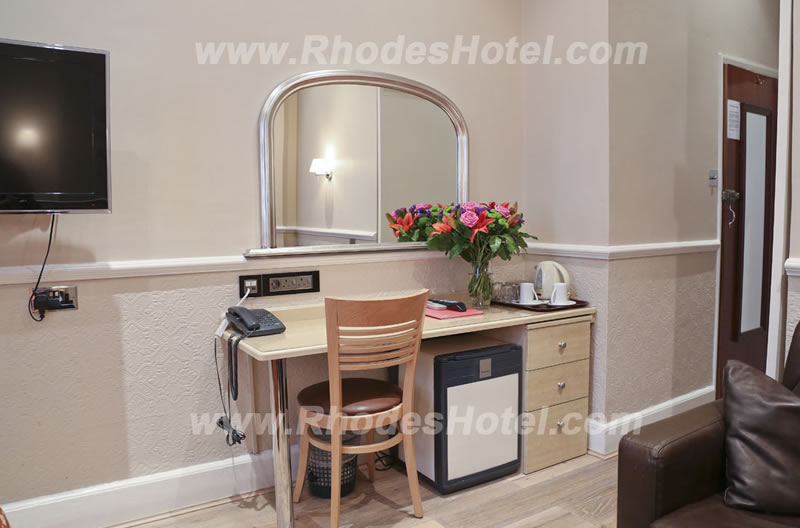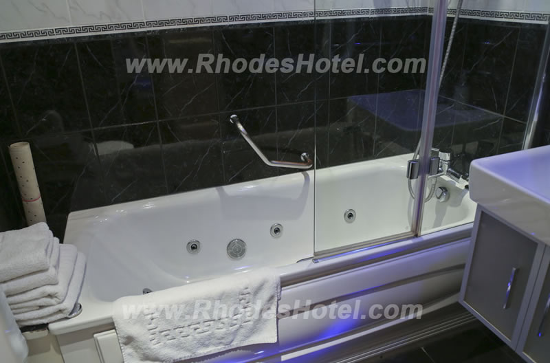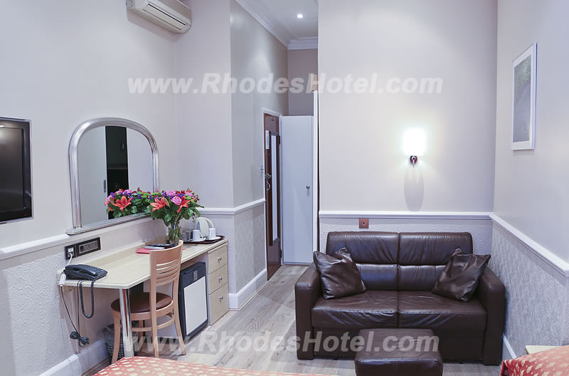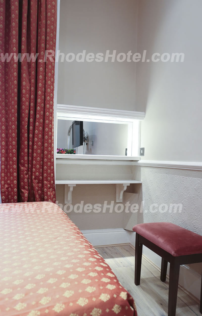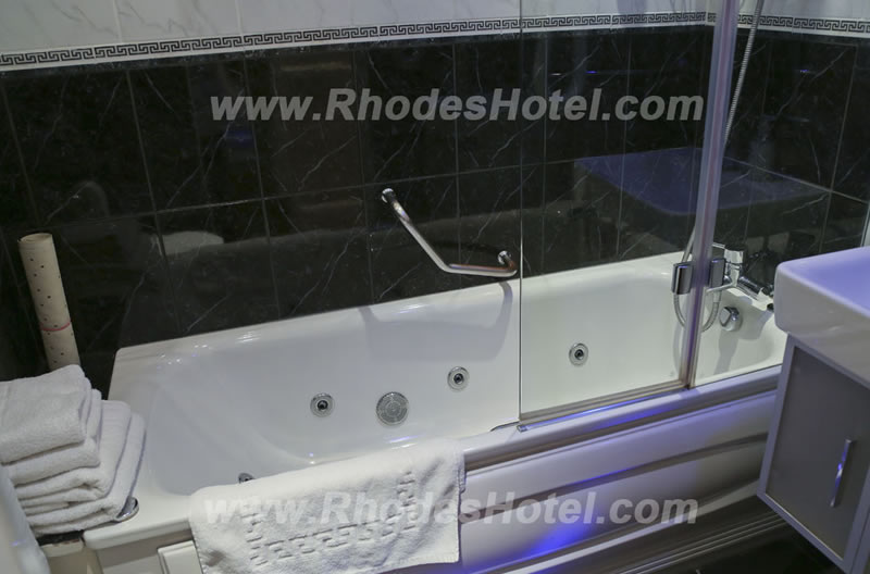 Rhodes Hotel has a wide range of rooms from compact size to larger, for the individual traveler to families of up to 6 people in a room. All rooms are en suite with shower room or the Deluxe rooms have a jacuzzi bathtub. Every room has a window, flat screen tv, small writing desk, tea & coffee making facilities and an empty minibar fridge for you to keep your personal snacks and drinks cool.