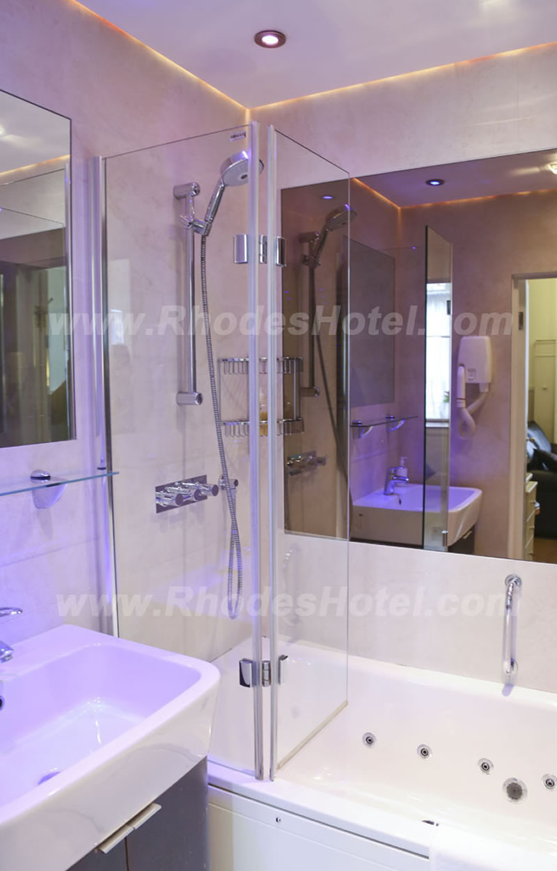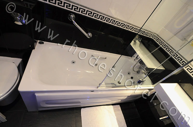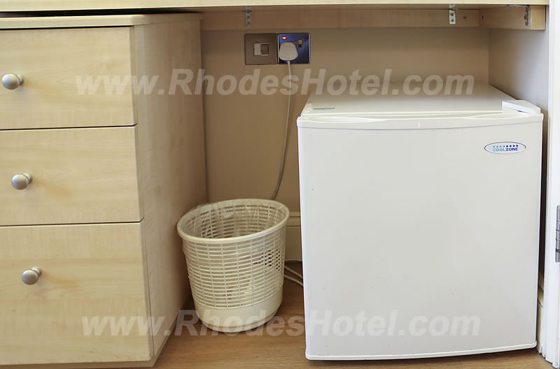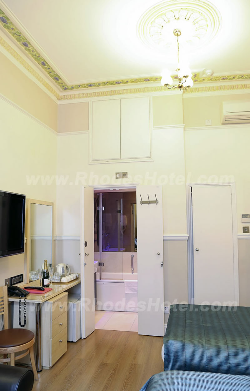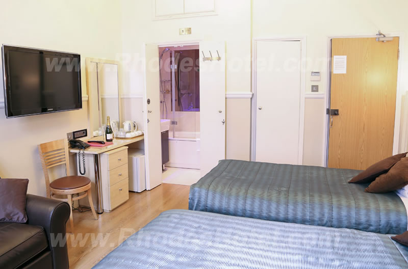 Rhodes Hotel has a wide range of rooms from compact size to larger, for the individual traveler to families of up to 6 people in a room. All rooms are en suite with shower room or the Deluxe rooms have a jacuzzi bathtub. Every room has a window, flat screen tv, small writing desk, tea & coffee making facilities and an empty minibar fridge for you to keep your personal snacks and drinks cool.