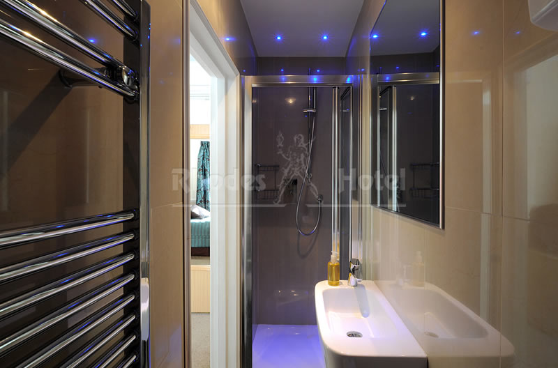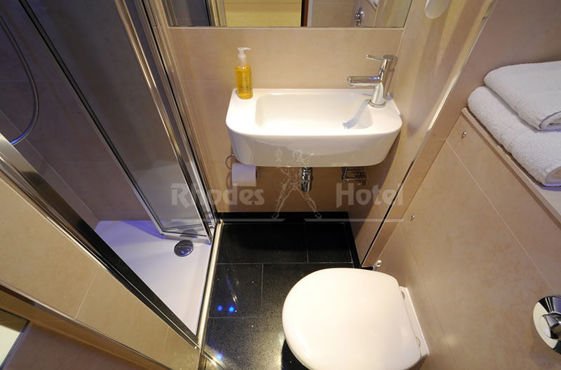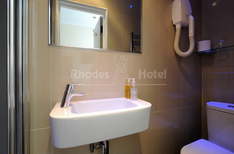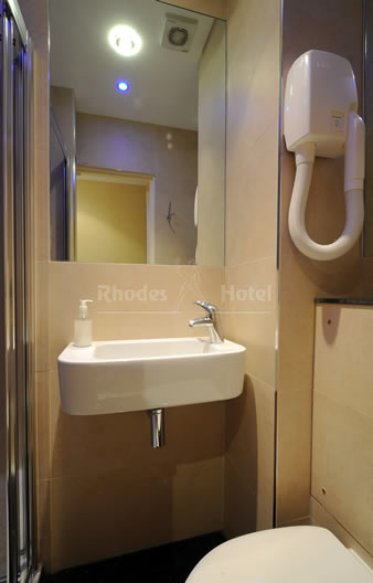 Rhodes Hotel has a wide range of rooms from compact size to larger, for the individual traveler to families of up to 6 people in a room. All rooms are en suite with shower room or the Deluxe rooms have a jacuzzi bathtub. Every room has a window, flat screen tv, small writing desk, tea & coffee making facilities and an empty minibar fridge for you to keep your personal snacks and drinks cool.